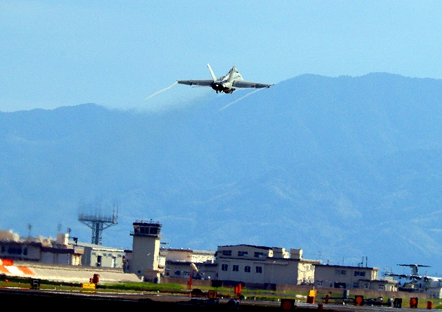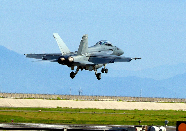 米海軍艦載機 F/A-18F スーパーホーネット 戦闘攻撃機(岩国基地)、NF、101番機がタッチアンド・ゴーして旋回(5周目) |