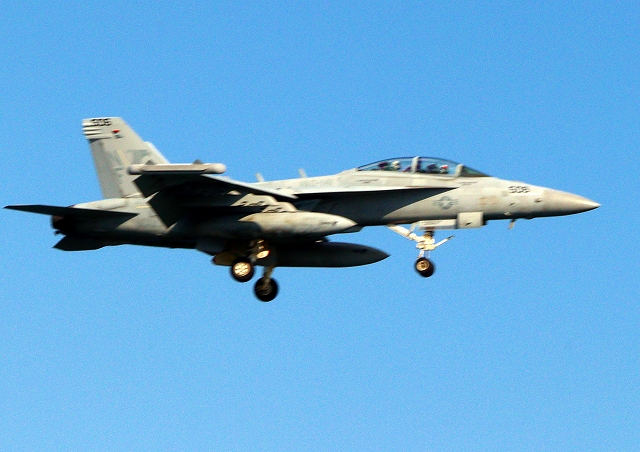 米海軍艦載機 EA-18G グラウラー 電子戦機戦闘攻撃機(岩国基地)、NF、503番機が旋回(1周目) |