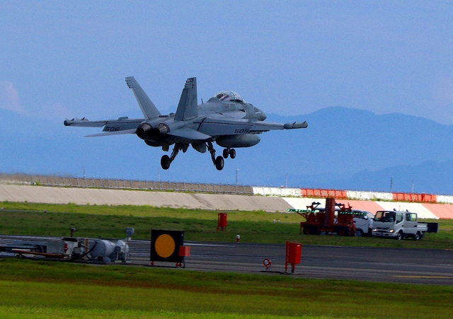 米海軍艦載機 EA-18G グラウラー 電子戦機戦闘攻撃機(岩国基地)、NF、503番機がタッチアンド・ゴーして旋回(1周目) |