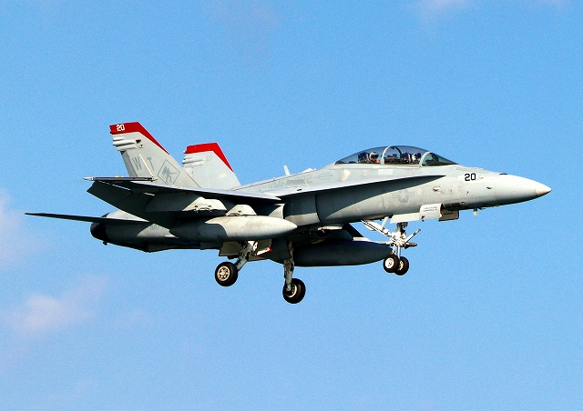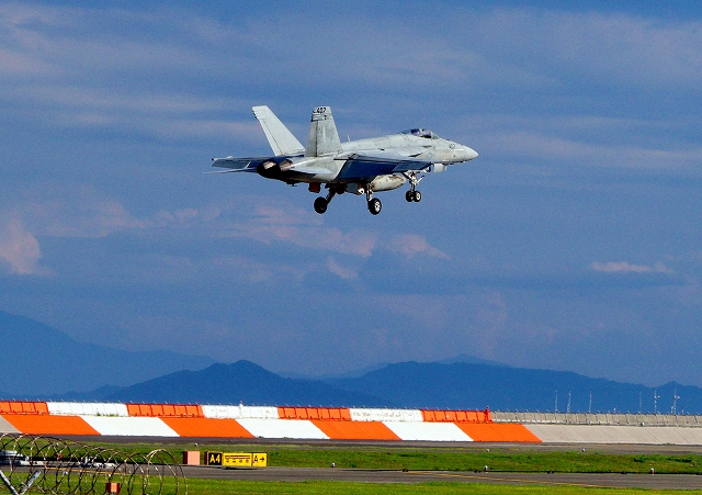 米海兵隊 F/A-18D ホーネット 戦闘攻撃機(岩国基地)、WT、20番機が着陸 |