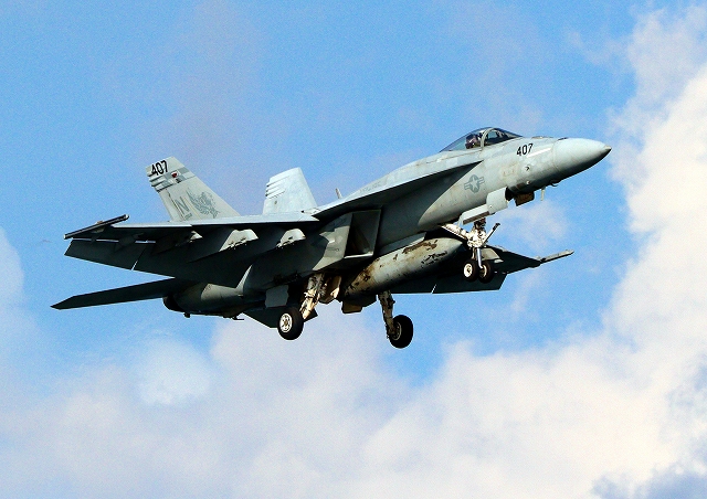 米海軍艦載機 F/A-18E スーパーホーネット 戦闘攻撃機(岩国基地)、NF、407番機が旋回(3周目) |