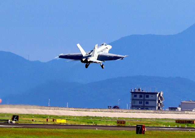 米海軍艦載機 F/A-18E スーパーホーネット 戦闘攻撃機(岩国基地)、NF、405番機がタッチアンド・ゴーして旋回(1周目) |