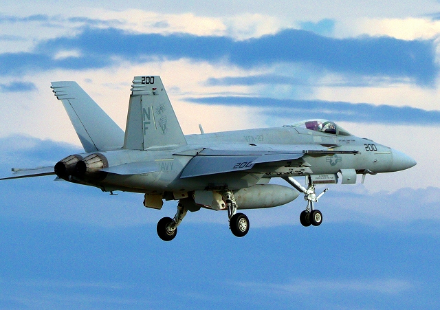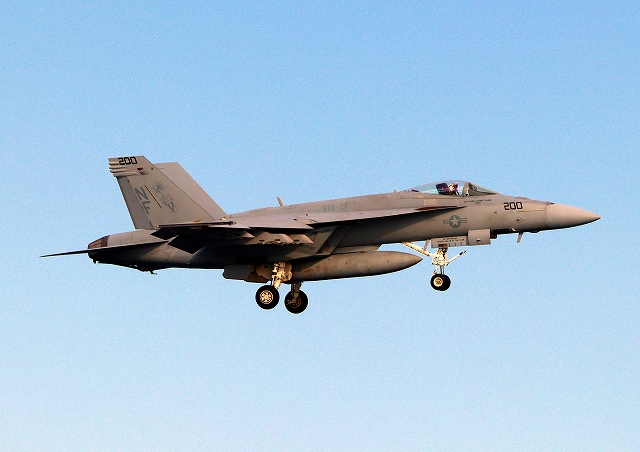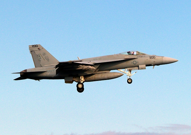 米海軍艦載機 F/A-18E スーパーホーネット 戦闘攻撃機(岩国基地)、NF、200番機が旋回(3周目) |