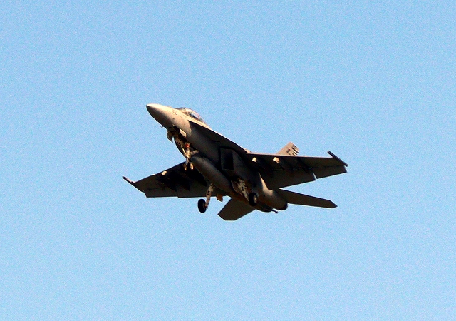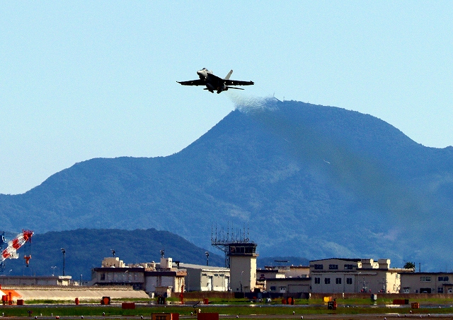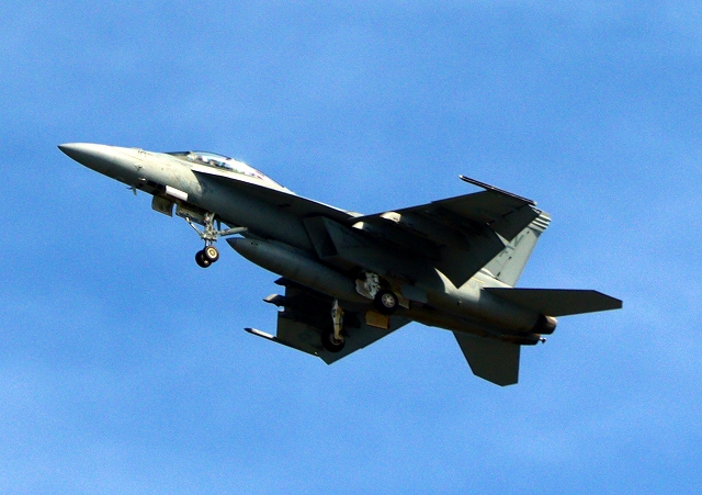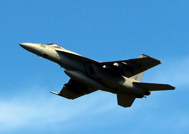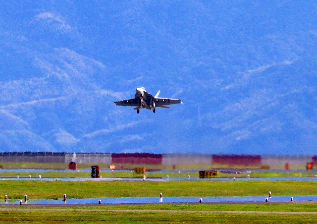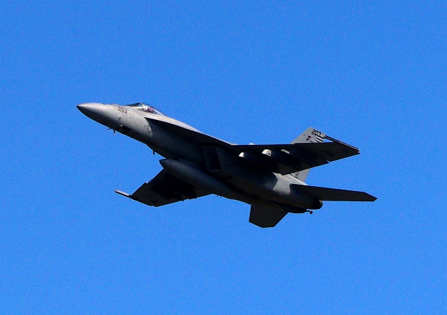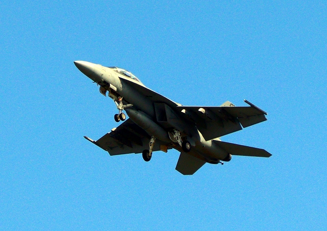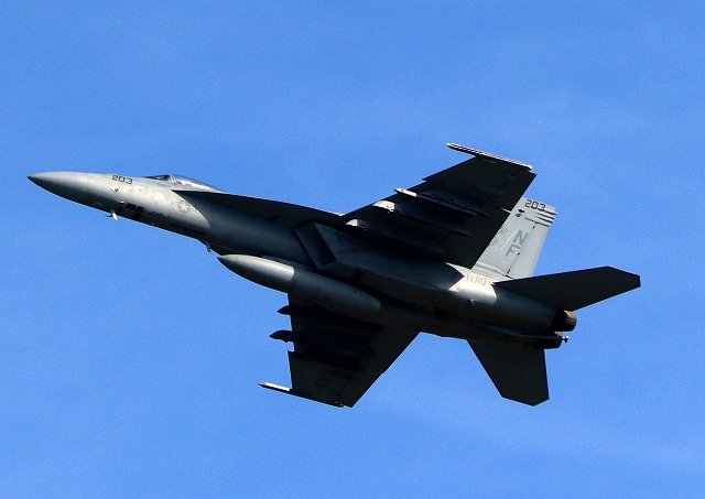 米海軍艦載機 F/A-18E スーパーホーネット 戦闘攻撃機(岩国基地)、NF、203番機が離陸 |