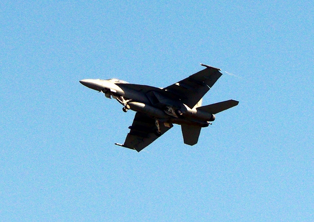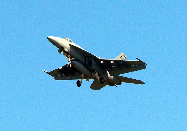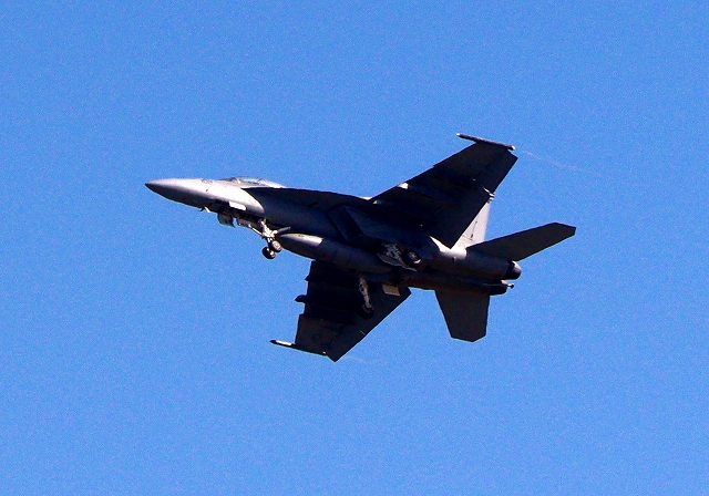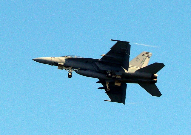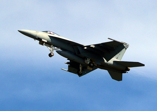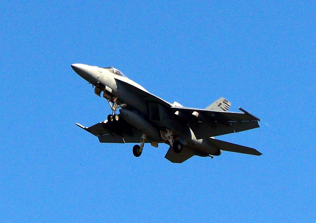 米海軍艦載機 F/A-18E スーパーホーネット 戦闘攻撃機(岩国基地)、NF、201番機が旋回(2周目) |