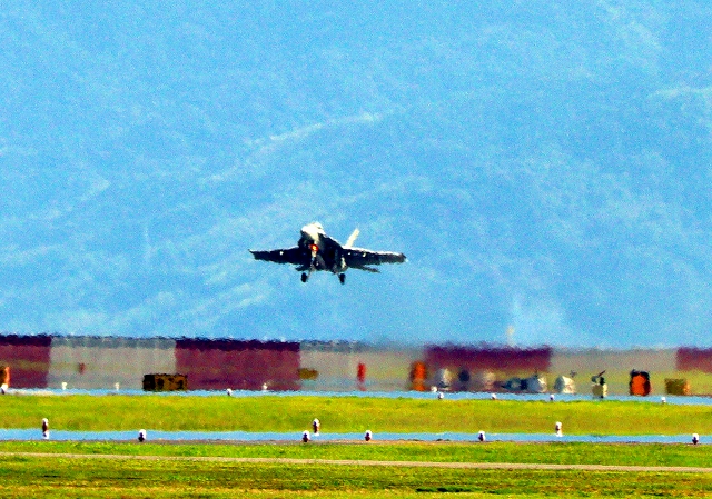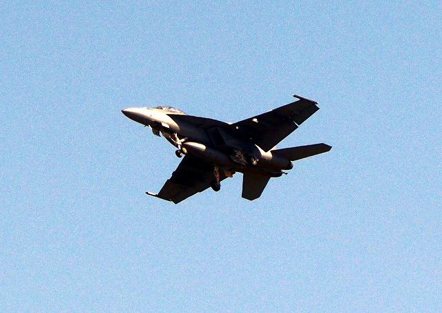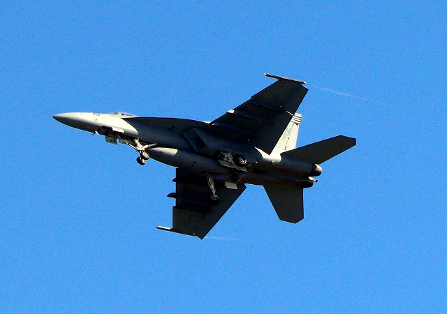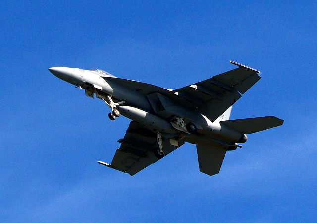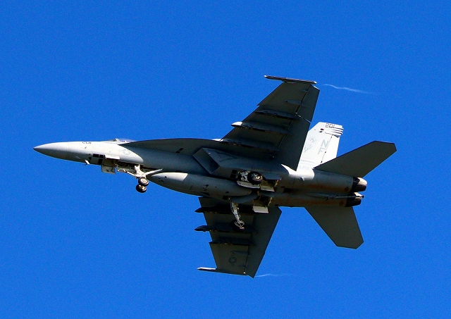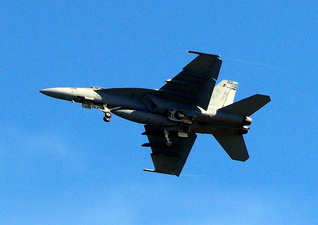 米海軍艦載機 F/A-18E スーパーホーネット 戦闘攻撃機(岩国基地)、NF、201番機が旋回(3周目) |
