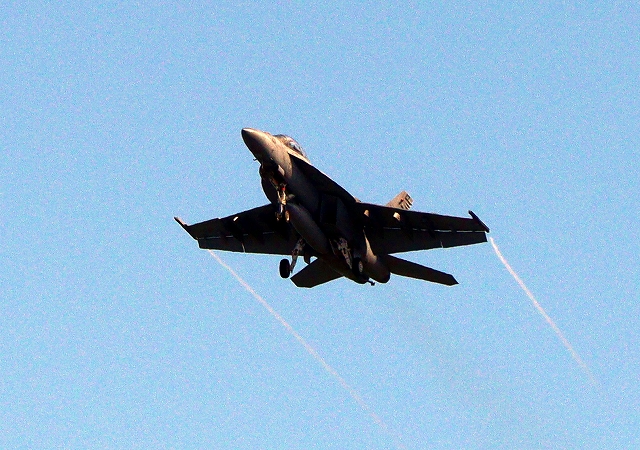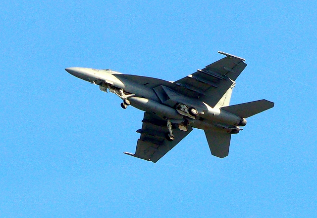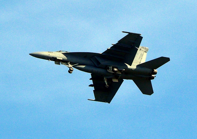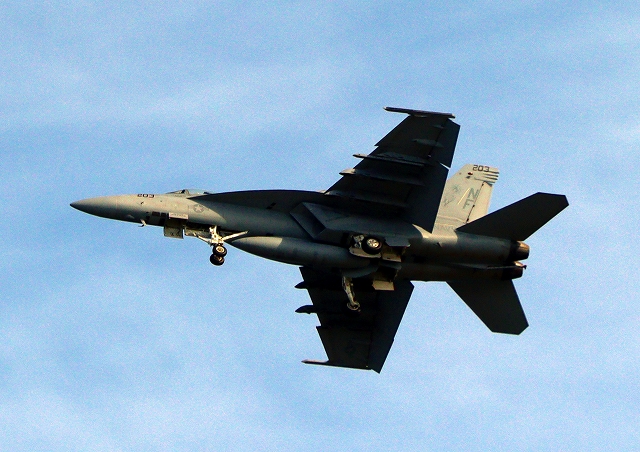 米海軍艦載機 F/A-18E スーパーホーネット 戦闘攻撃機(岩国基地)、NF、203番機がタッチアンド・ゴーして旋回(2周目) |