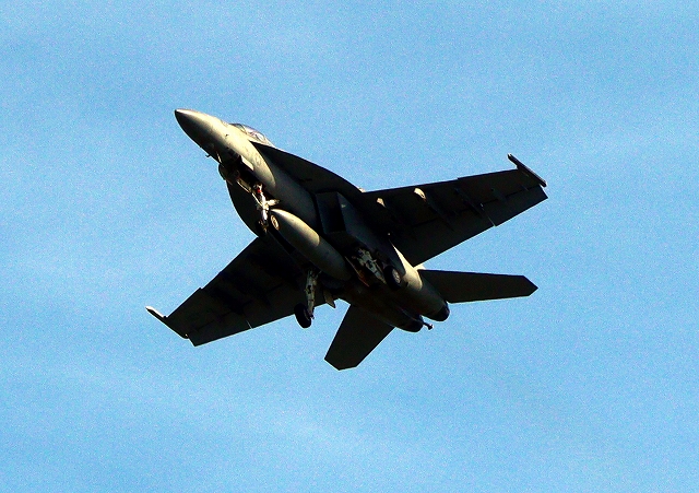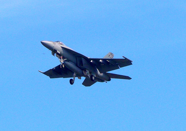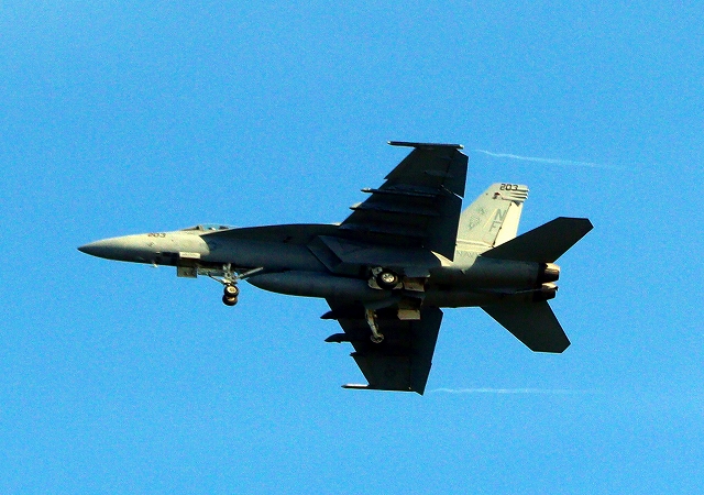 米海軍艦載機 F/A-18E スーパーホーネット 戦闘攻撃機(岩国基地)、NF、203番機が帰還、旋回(2周目) |