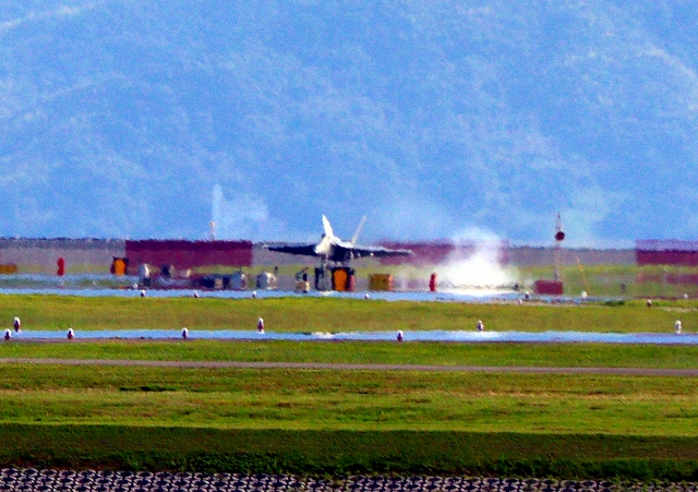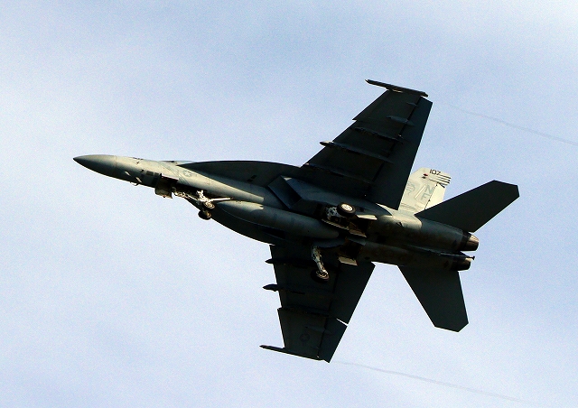 米海軍艦載機 F/A-18F スーパーホーネット 戦闘攻撃機(岩国基地)、NF、107番機が離陸 |