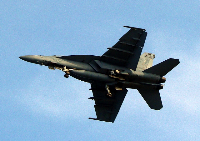 米海軍艦載機 F/A-18F スーパーホーネット 戦闘攻撃機(岩国基地)、NF、107番機が旋回(5周目) |