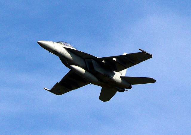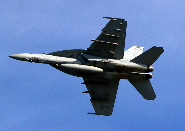 米海軍艦載機 F/A-18F スーパーホーネット 戦闘攻撃機(岩国基地)、NF、107番機が旋回(4周目) |