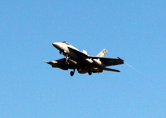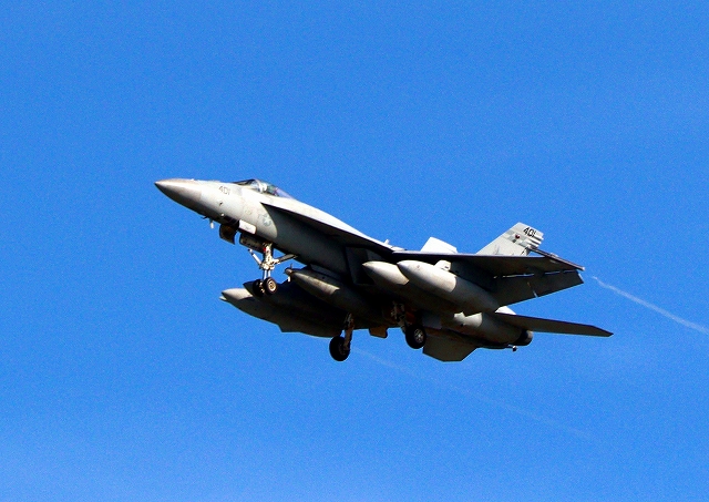 米海軍艦載機 F/A-18E スーパーホーネット 戦闘攻撃機(岩国基地)、NF、401番機がタッチアンド・ゴーして旋回(6周目) |