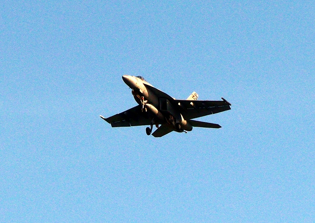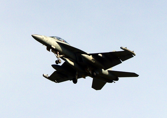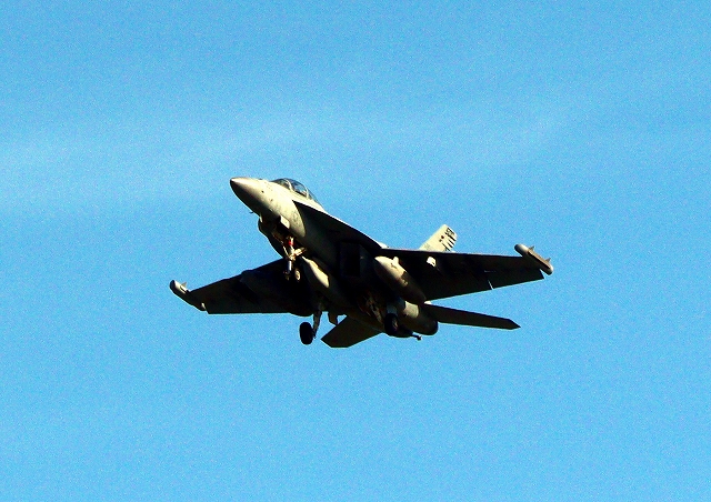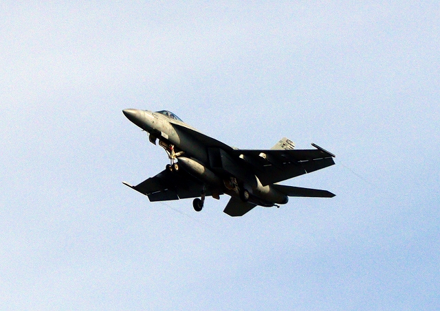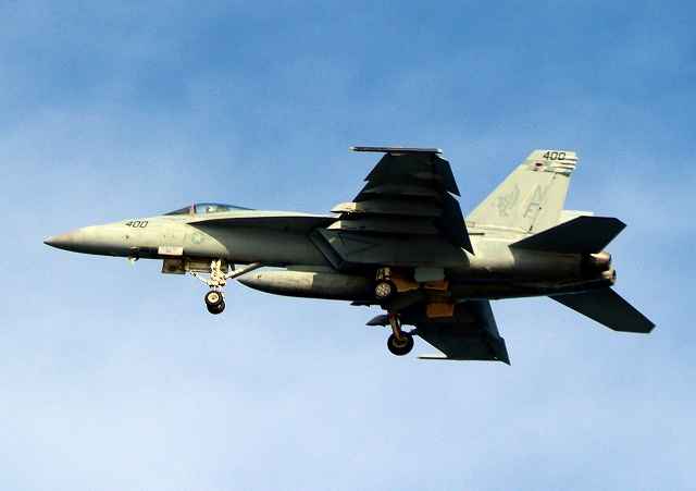 米海軍艦載機 F/A-18E スーパーホーネット 戦闘攻撃機(岩国基地)、NF、400番機が旋回(4周目) |