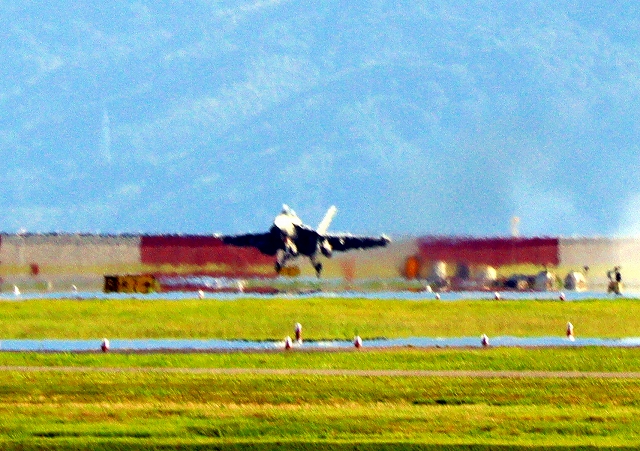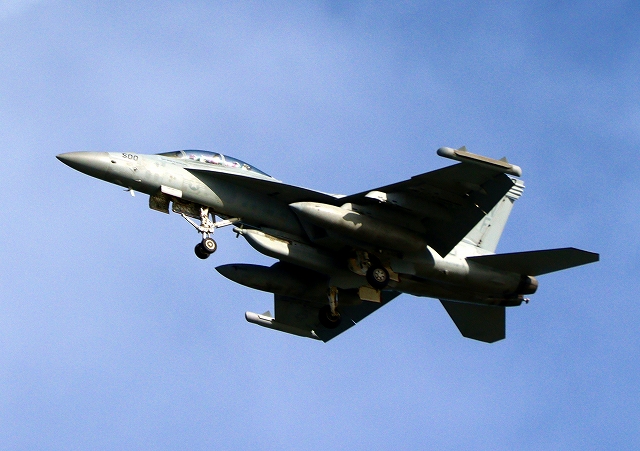 米海軍艦載機 F/A-18E スーパーホーネット 戦闘攻撃機(岩国基地)、NF、400番機がタッチアンド・ゴーして旋回(5周目) |