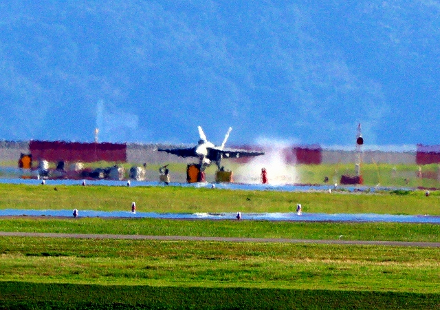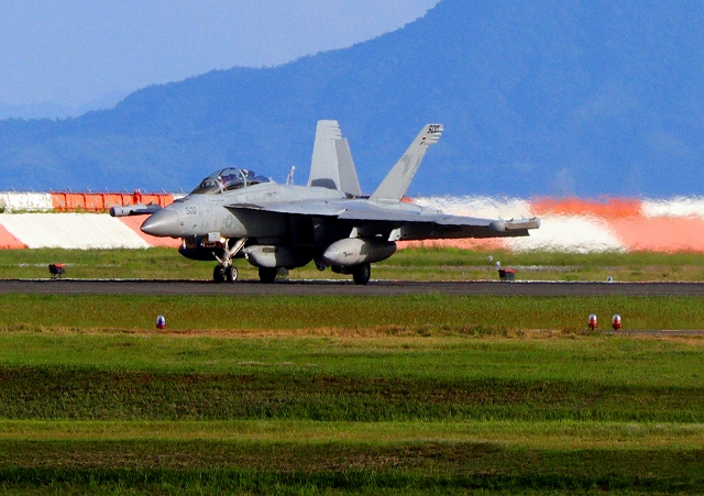 米海軍艦載機 EA-18G グラウラー 電子戦機戦闘攻撃機(岩国基地)、NF、500番機が着陸 |