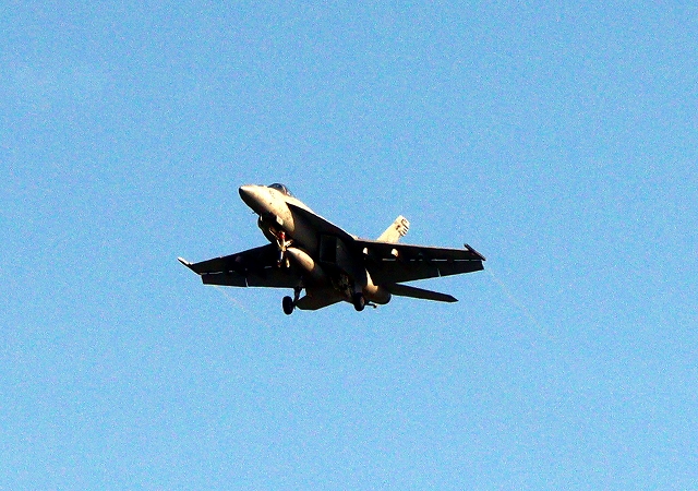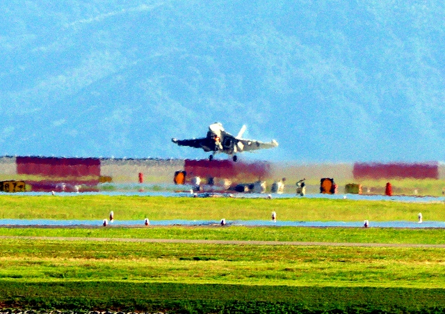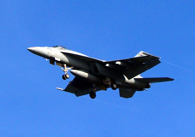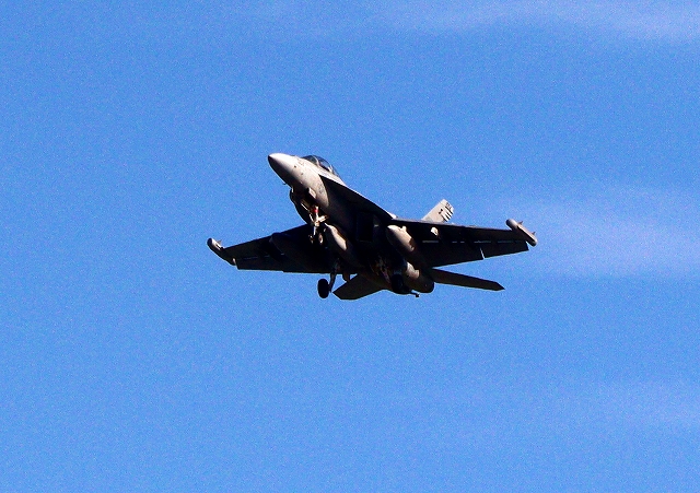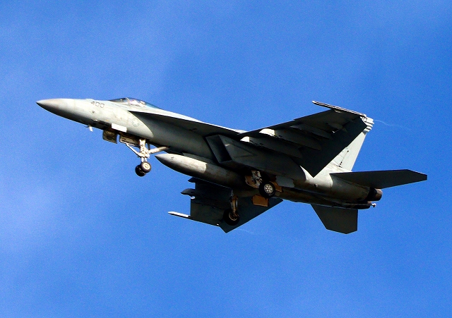 米海軍艦載機 F/A-18E スーパーホーネット 戦闘攻撃機(岩国基地)、NF、400番機がタッチアンド・ゴーして旋回(5周目) |