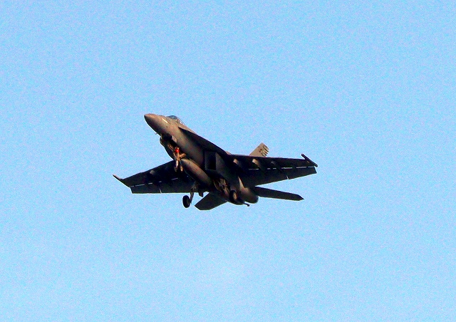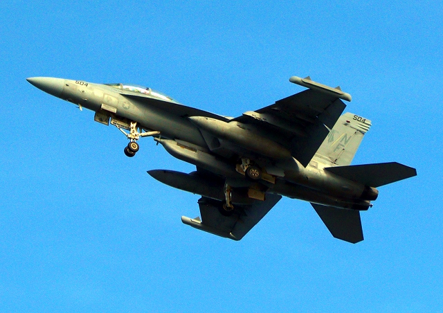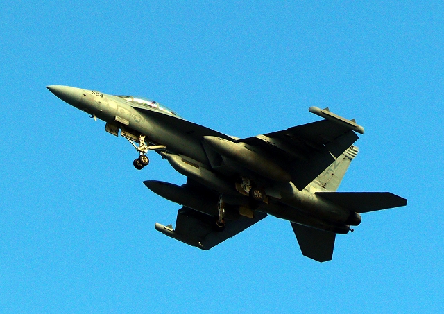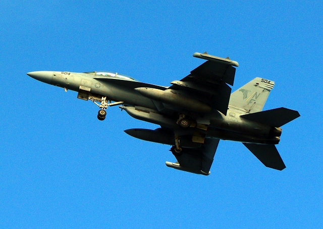 米海軍艦載機 F/A-18E スーパーホーネット 戦闘攻撃機(岩国基地)、NF、400番機がタッチアンド・ゴーして旋回(6周目) |