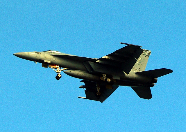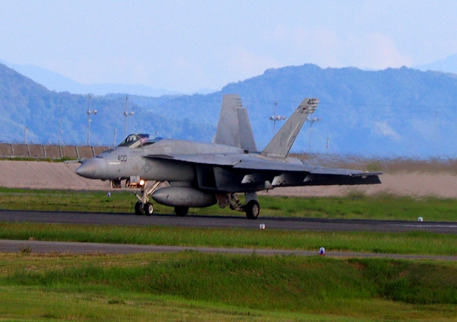 米海軍艦載機 F/A-18E スーパーホーネット 戦闘攻撃機(岩国基地)、NF、400番機が着陸 |
