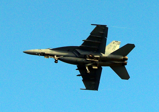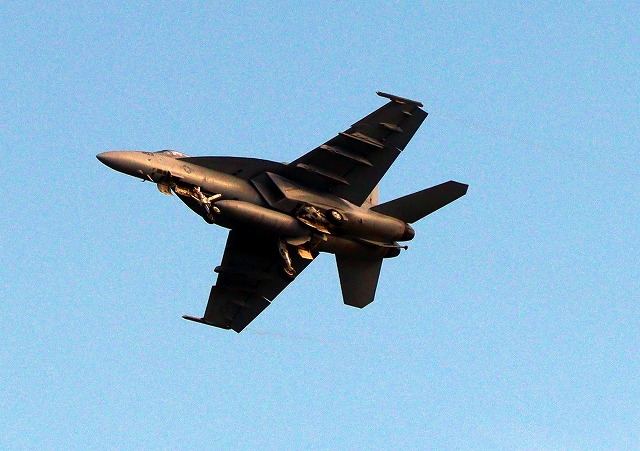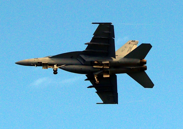 米海軍艦載機 F/A-18E スーパーホーネット 戦闘攻撃機(岩国基地)、NF、201番機がタッチアンド・ゴーして旋回 |
