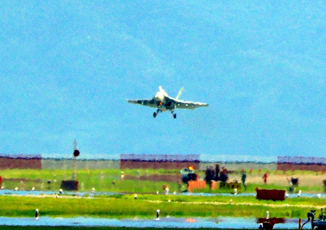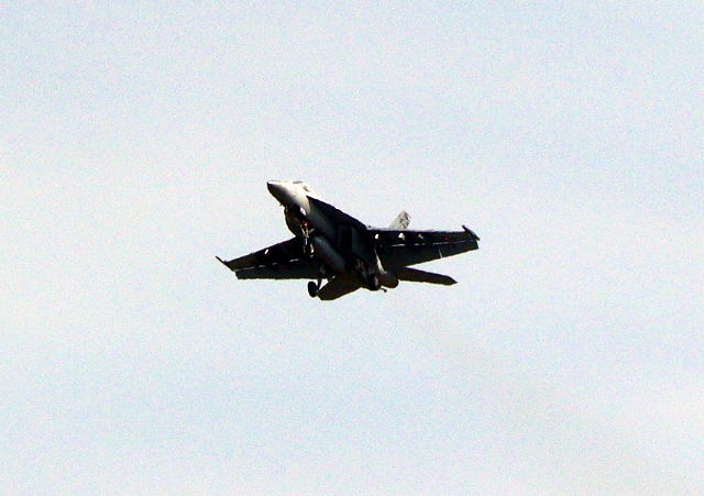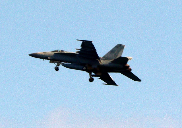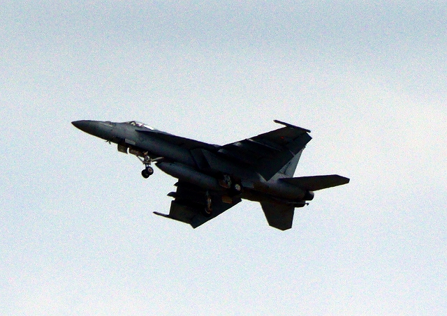 米海軍艦載機 F/A-18E スーパーホーネット 戦闘攻撃機(岩国基地)、NF、410番機機がタッチアンド・ゴーして旋回(4周目) |