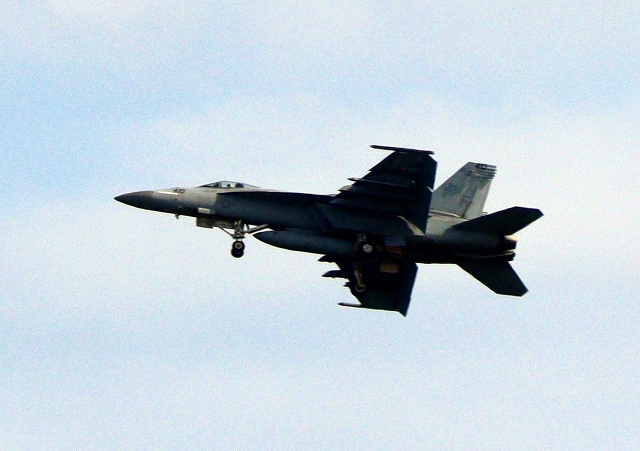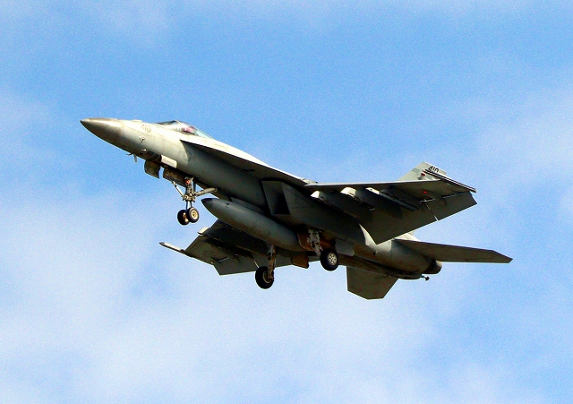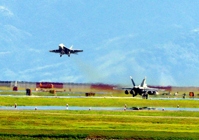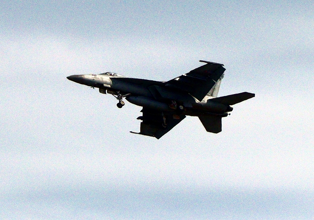 米海軍艦載機 F/A-18E スーパーホーネット 戦闘攻撃機(岩国基地)、NF、410番機機がタッチアンド・ゴーして旋回(6周目) |
