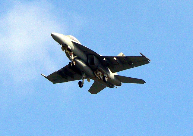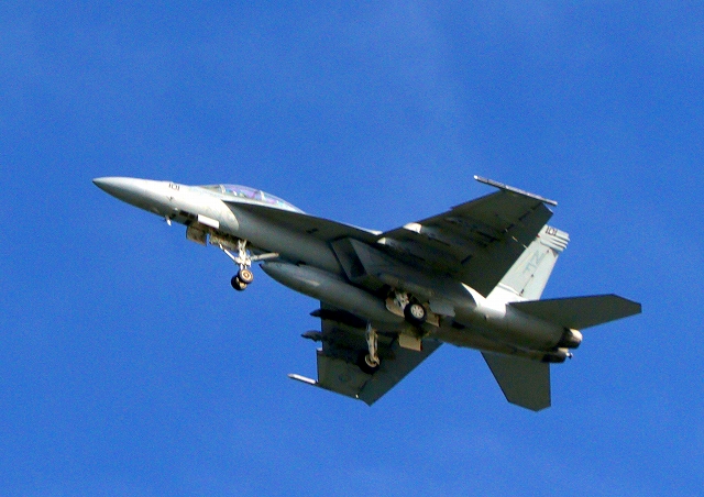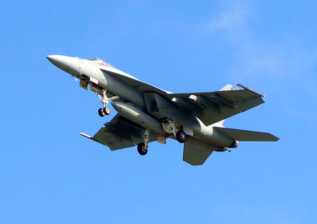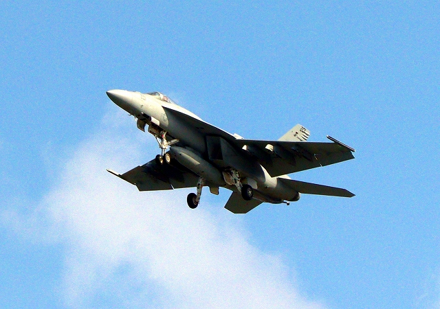 米海軍艦載機 F/A-18E スーパーホーネット 戦闘攻撃機(岩国基地)、NF、201番機がタッチアンド・ゴーして旋回(6周目) |