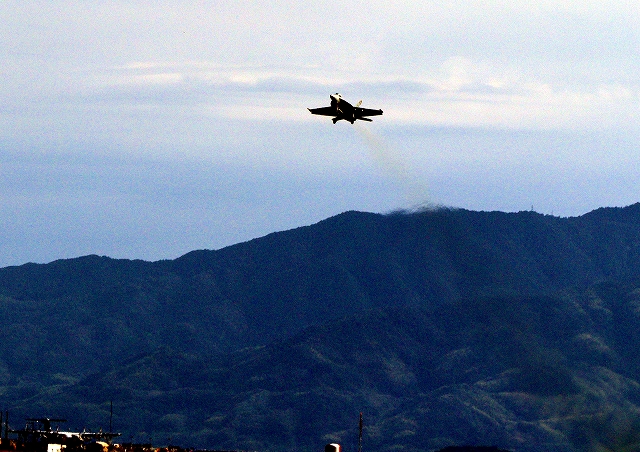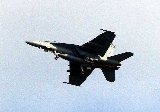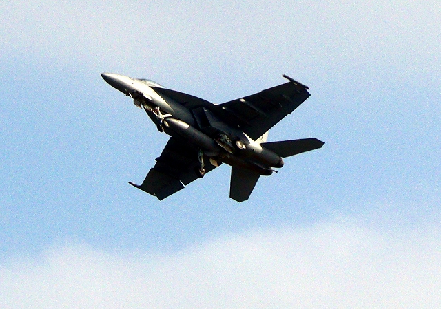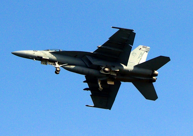 米海軍艦載機 F/A-18F スーパーホーネット 戦闘攻撃機(岩国基地)、NF、102番機がタッチアンド・ゴーして旋回(3周目) |