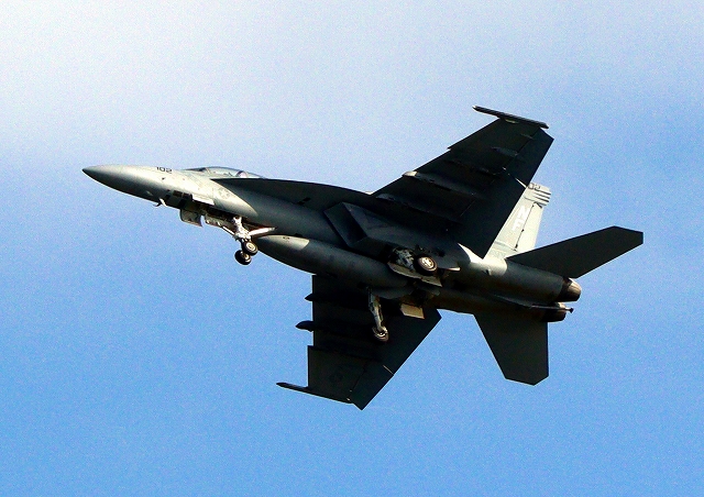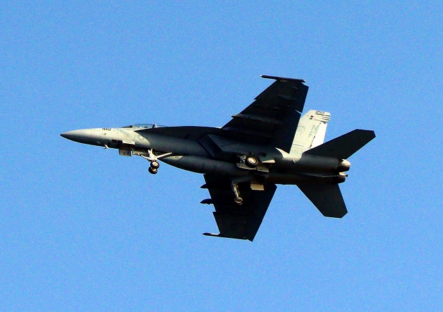 米海軍艦載機 F/A-18F スーパーホーネット 戦闘攻撃機(岩国基地)、NF、102番機がタッチアンド・ゴーして旋回(4周目) |