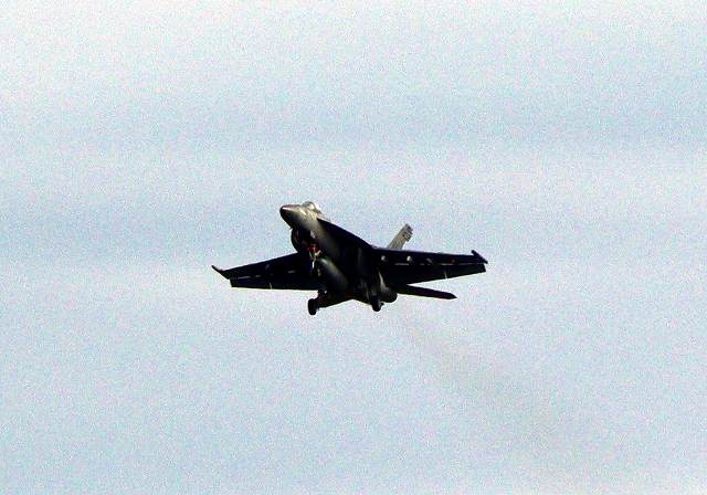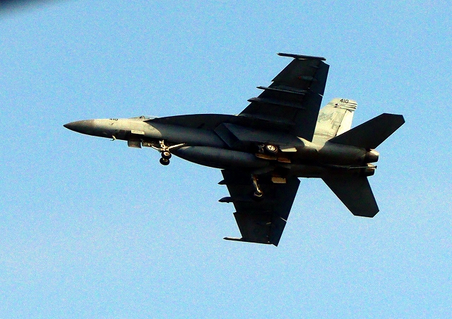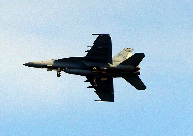 米海軍艦載機 F/A-18E スーパーホーネット 戦闘攻撃機(岩国基地)、NF、410番機が旋回(6周目) |