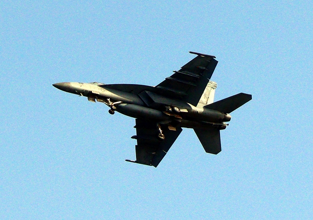 米海軍艦載機 F/A-18E スーパーホーネット 戦闘攻撃機(岩国基地)、NF、410番機が旋回(5周目) |