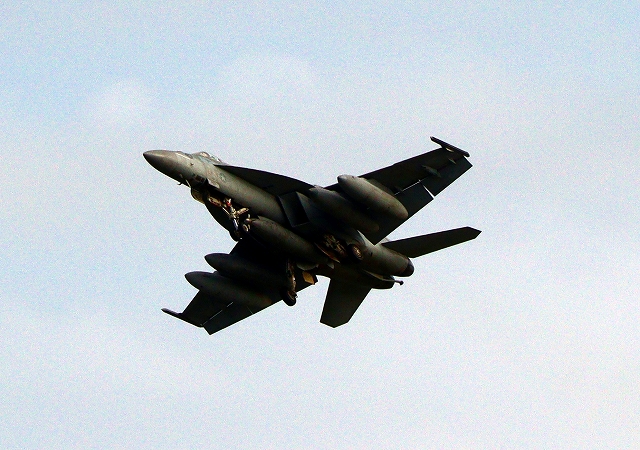 米海軍艦載機 F/A-18E スーパーホーネット 戦闘攻撃機(岩国基地)、NF、401番機がタッチアンド・ゴーして旋回(3周目) |