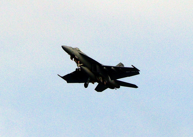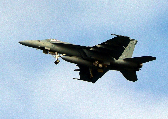 米海軍艦載機 F/A-18E スーパーホーネット 戦闘攻撃機(岩国基地)、NF、200番機がタッチアンド・ゴーして旋回(5周目) |