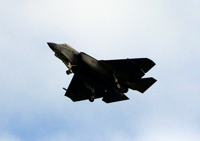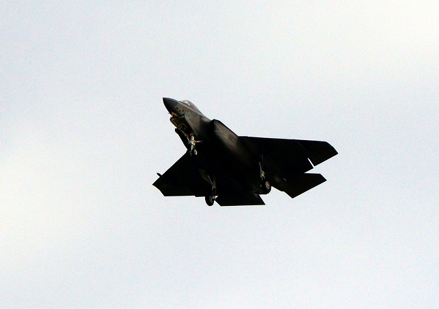 米海軍艦載機 F-35C ライトニングⅡ ステルス戦闘機(岩国基地)、NF、300番機がタッチアンド・ゴーして旋回(6周目) |