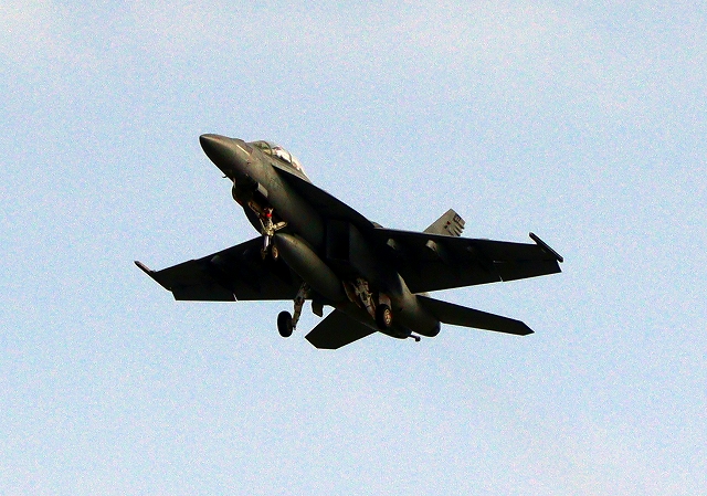 米海軍艦載機 F/A-18E スーパーホーネット 戦闘攻撃機(岩国基地)、NF、401番機が着陸 15時04分に離陸した機。4回旋回。 |
