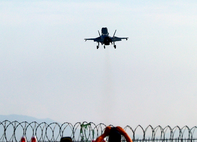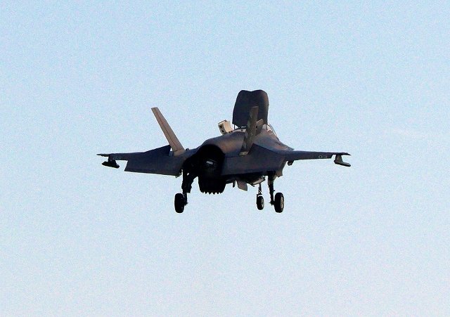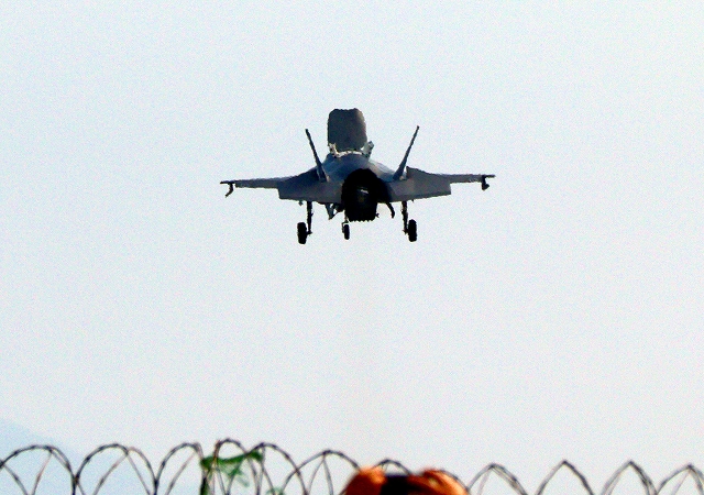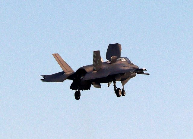 米海兵隊 F-35B ライトニングⅡ ステルス戦闘機(岩国基地)、CF、03番機は北の垂直着陸パッドの上でホバリング |