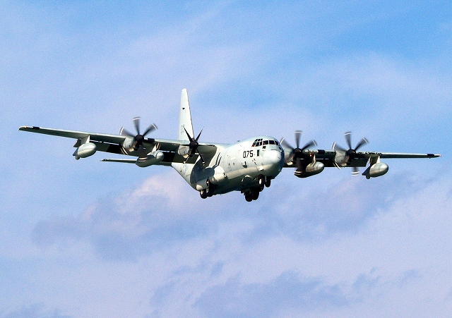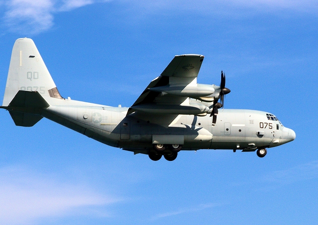 米海兵隊 KC-130J 空中給油機 スーパーハーキュリーズ(岩国基地)、QD 8075番機が着陸 |