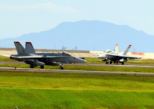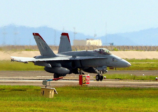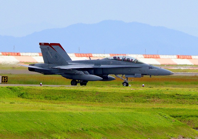 米海兵隊 F/A-18D ホーネット 戦闘攻撃機(岩国基地)、WT、20番機が着陸 |