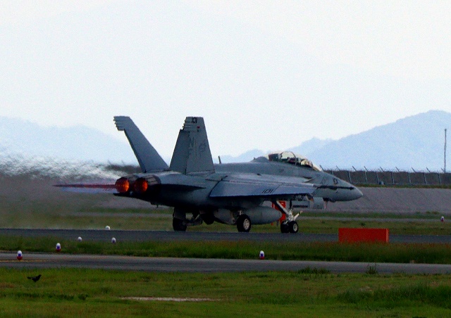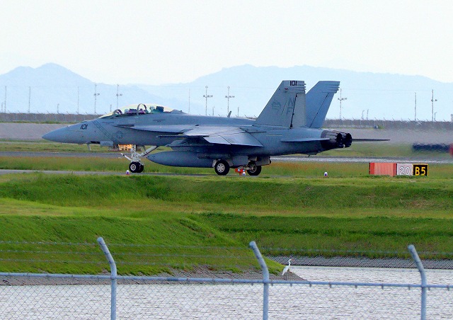 米海軍艦載機 F/A-18F スーパーホーネット 戦闘攻撃機(岩国基地)、NF、101番機が離陸 |