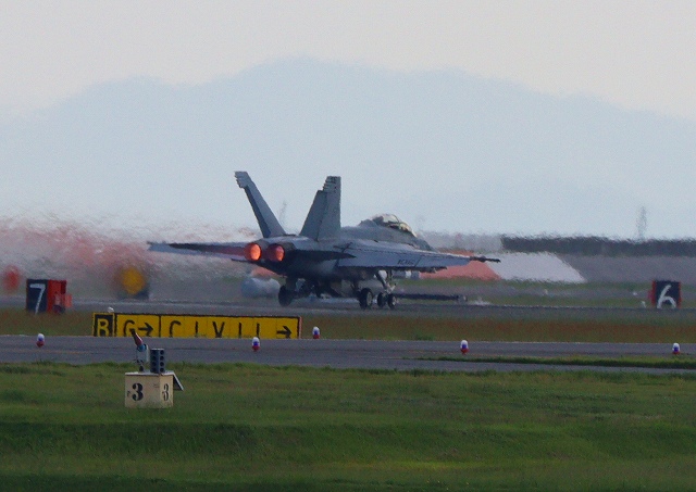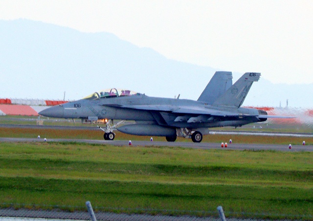 米海軍艦載機 F/A-18F スーパーホーネット 戦闘攻撃機(岩国基地)、NF、106番機が離陸 |