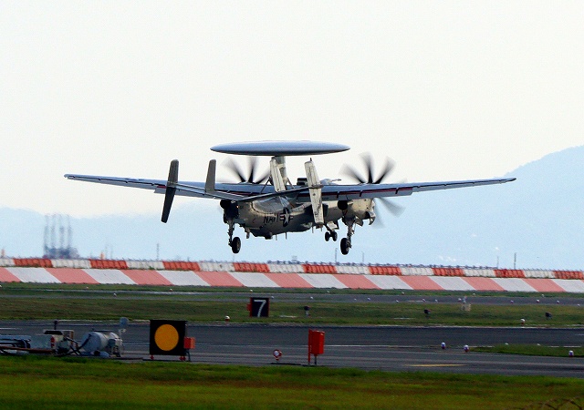 米海軍艦載機 E-2D アドヴァンスド・ホークアイ 早期警戒機(岩国基地)、602番機が着陸 |