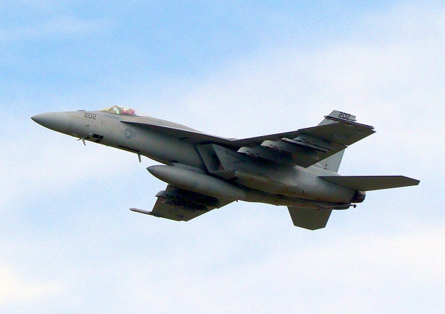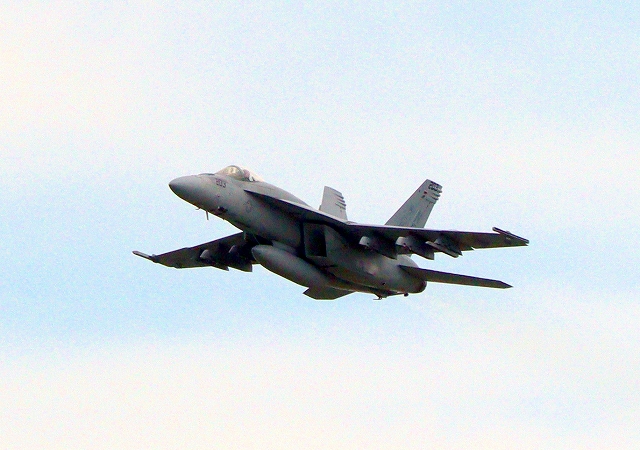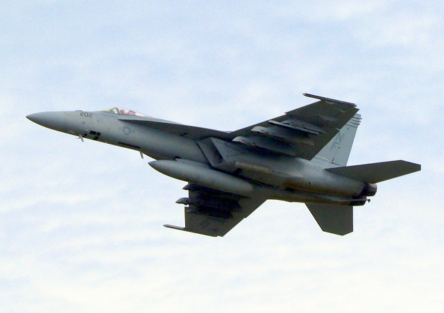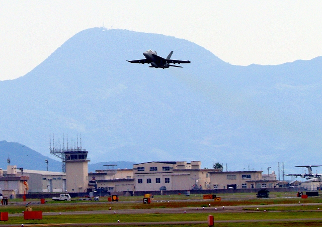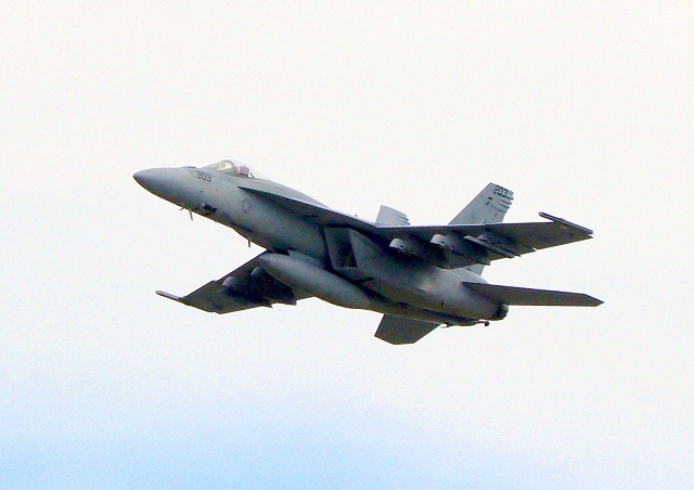 米海軍艦載機 F/A-18E スーパーホーネット 戦闘攻撃機(岩国基地)、NF、202番機が離陸 |
