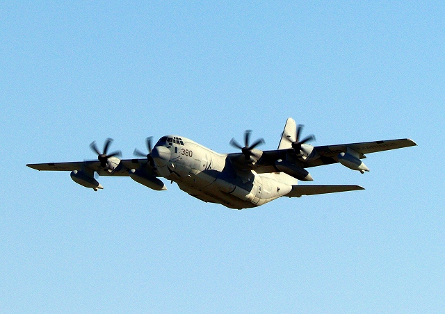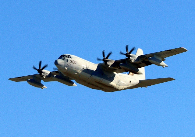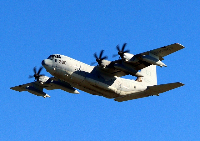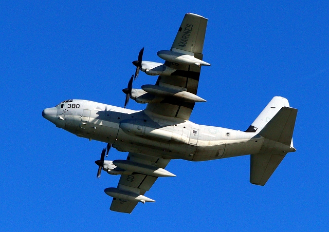 米海兵隊 KC-130J 空中給油機 スーパーハーキュリーズ(岩国基地)、QD 6380番機が離陸 |