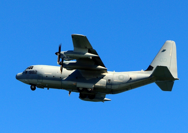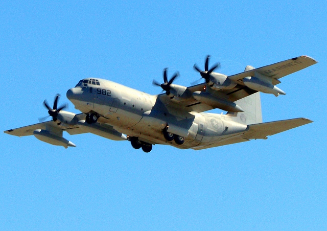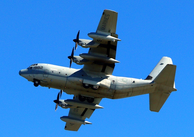 米海兵隊 KC-130J 空中給油機 スーパーハーキュリーズ(岩国基地)、QD 7982番機が旋回 |