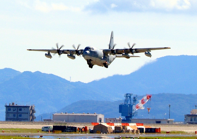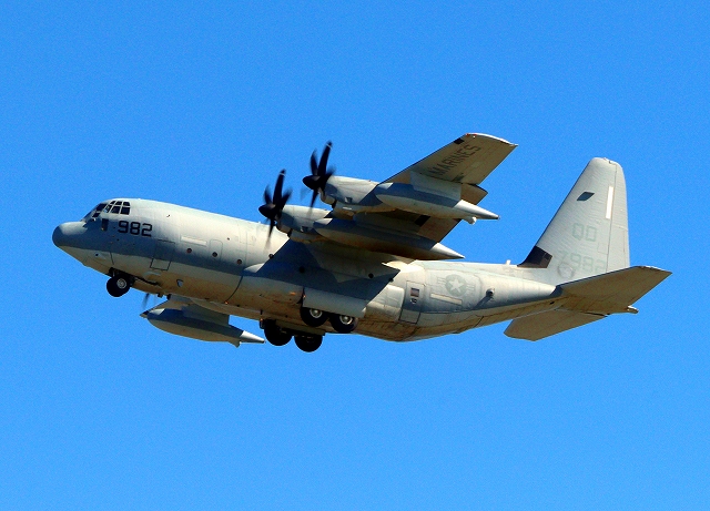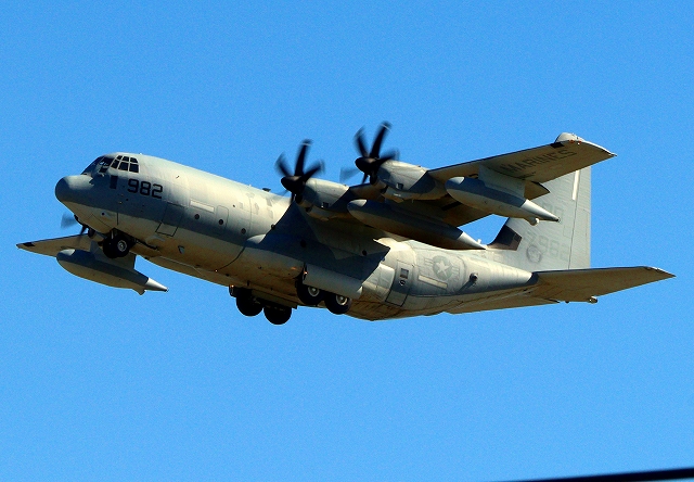 米海兵隊 KC-130J 空中給油機 スーパーハーキュリーズ(岩国基地)、QD 7982番機が離陸 |