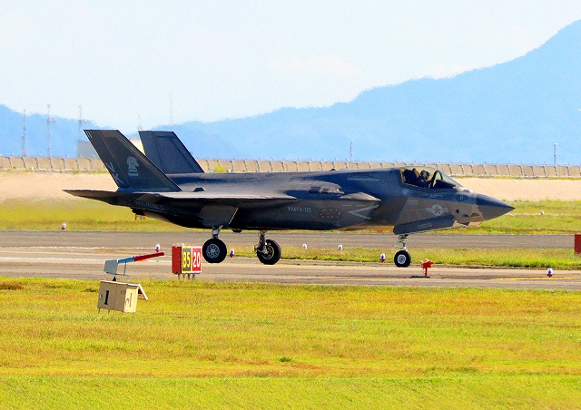米海兵隊 F-35B ライトニングⅡ ステルス戦闘機(岩国基地)、VK、11番機が帰還、旋回 |