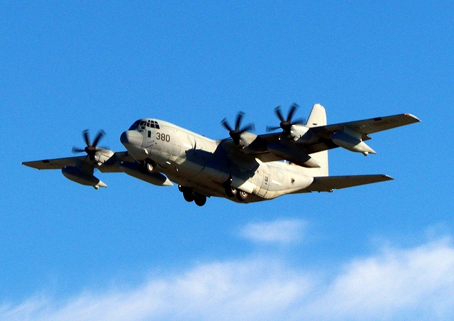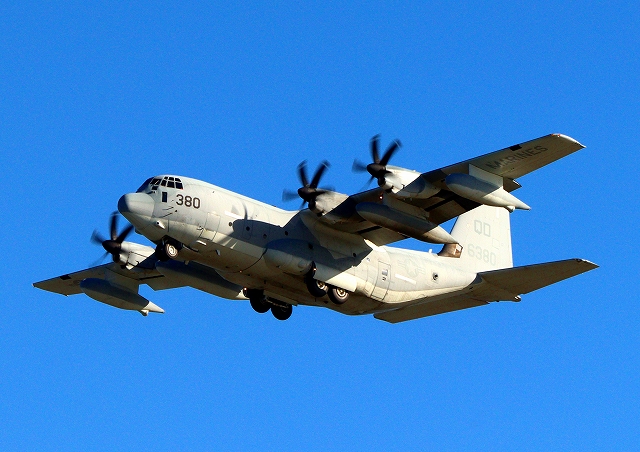 米海兵隊 KC-130J 空中給油機 スーパーハーキュリーズ(岩国基地)、QD 6380番機が離陸 |