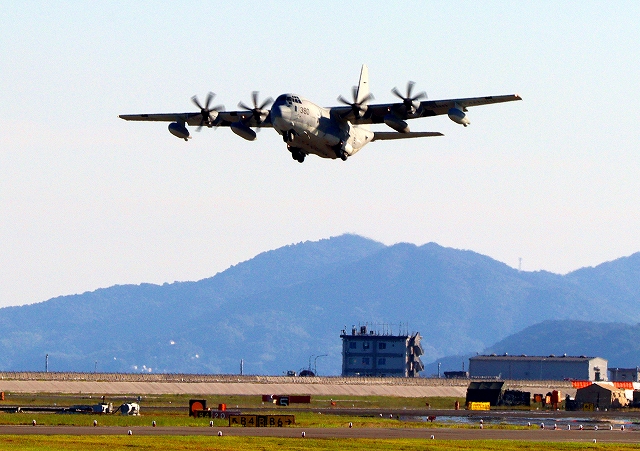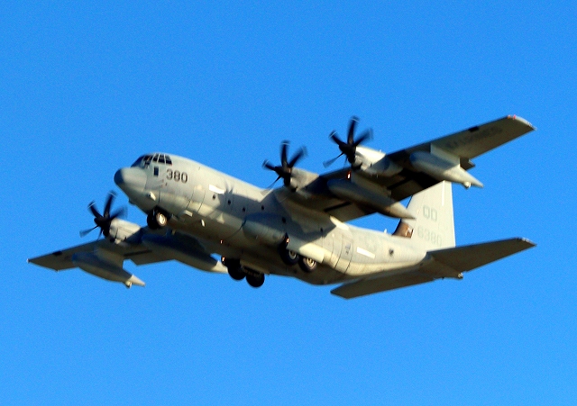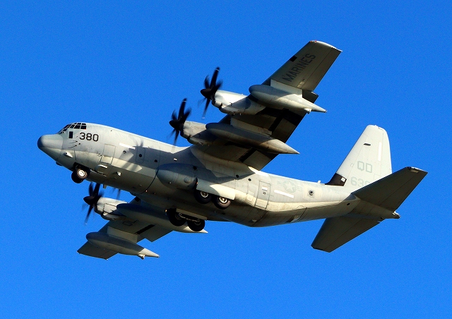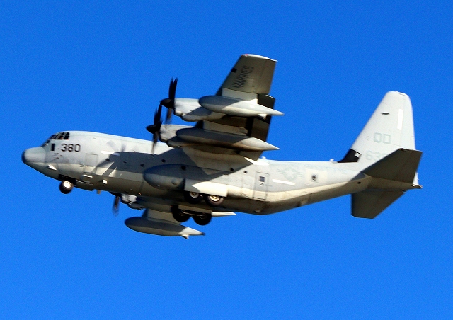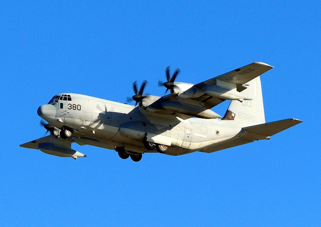 米海兵隊 KC-130J 空中給油機 スーパーハーキュリーズ(岩国基地)、QD 6380番機が旋回 |
