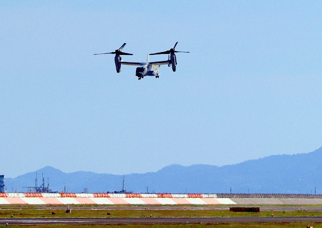 米海軍艦載機 CMV-22B オスプレイ(岩国基地)、73-9460番機が旋回、転換モード |