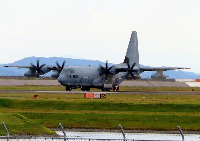 米海兵隊 KC-130J 空中給油機 スーパーハーキュリーズ(岩国基地)、QD 7109番機が着陸 |