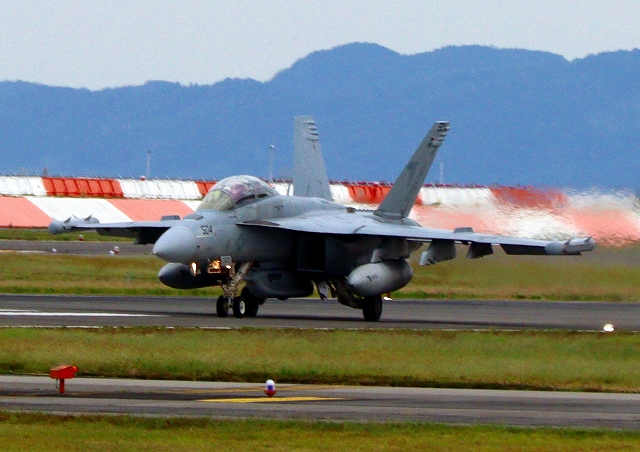 米海軍艦載機 F/A-18F スーパーホーネット 戦闘攻撃機(岩国基地)、NF、114番機が着陸 |
